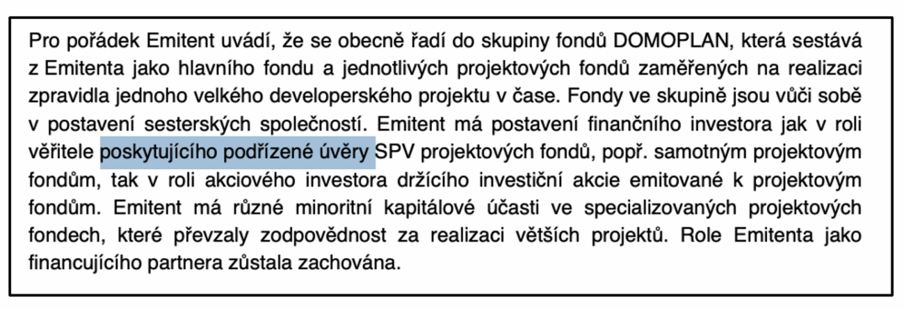 Tyto podřízené půjčky sice nesou úrok 12 %, což není úplně málo, ale pořád jde o půjčování mimo skupinu, a hlavně na úrovni, která je v hierarchii až za ostatními věřiteli. Mnoho těch půjček má roční splatnost a podmínky jsou dost flexibilní, protože obě strany ovládá stejný člověk. Riziko je v tom, že i když se půjčky splatí, mohou být klidně znovu použité stejným způsobem (prospekt zakazuje jen jejich navyšování z nových zdrojů, ne jejich opakované protočení).