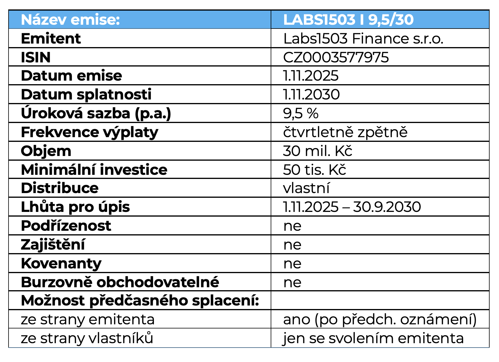 Dluhopisový program emitenta Labs1503 Finance je nastaven s celkovým limitem 500 milionů Kč s dobou trvání 5 let. V rámci tohoto období může emitent flexibilně vydávat jednotlivé tranše dle aktuální potřeby financování. Všechny emise jsou nezajištěné a nepodřízené, přičemž chybí i nějaké kovenanty.