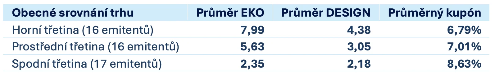 Ještě důležitější je, že hlavní rozdíl mezi třetinami dělá ekonomická kvalita emitenta, nikoli design emise. Zatímco ekonomické skóre padá od horní třetiny ke spodní z 7,99 přes 5,63 až na 2,35 bodu, u designu vidíme méně výrazný pokles – z 4,38 na 3,05 a 2,18 bodu. To podporuje hlavní tezi celého srovnání: na českém trhu rozhoduje především síla emitenta. Zároveň je výmluvné, že ani horní třetina trhu se v designu v průměru nedostává nad 5 bodů z 10. To ukazuje, že standard ochrany věřitele je nastaven poměrně nízko i u kvalitnější části trhu.