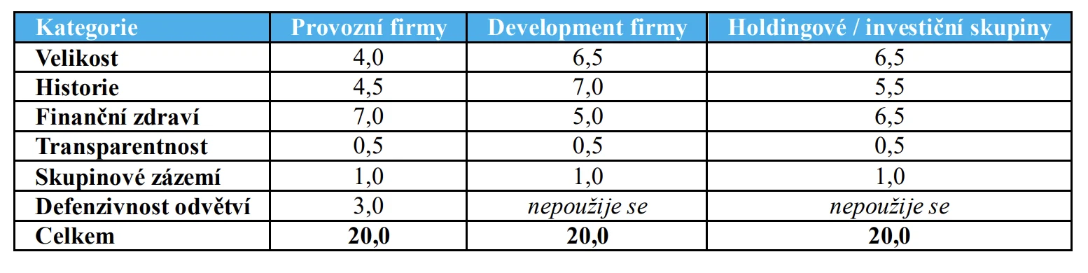 Základ ekonomického scorecardu tvoří šest oblastí: velikost, historie, finanční zdraví, transparentnost, skupinové zázemí a u provozních firem také defenzivnost odvětví. U provozních firem má největší váhu finanční zdraví a charakter odvětví, protože právě zde mají výsledovka, cash flow a základní poměrové ukazatele nejvyšší vypovídací schopnost. U developerských firem naopak více posilují historie a velikost relevantní skupiny, protože účetní výsledky bývají výrazně ovlivněny projektovým cyklem, časováním prodejů a specifiky účetního zachycení. Holdingové a investiční skupiny pak stojí mezi oběma světy: finanční zdraví zůstává důležité, ale větší roli zde hraje i velikost a historie skupiny jako celku.