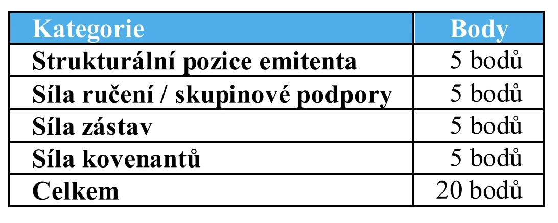 Designový scorecard hodnotí, jak je konkrétní dluhopis postaven z pohledu věřitele. Nesleduje tedy ekonomickou sílu emitenta samotnou, ale to, jakou ochranu investor dostává v konstrukci emise. Model stojí na čtyřech základních blocích: strukturální pozice emitenta, síla ručení či skupinové podpory, síla zástav a síla kovenantů. Každý z těchto bloků tvoří samostatný level ochrany věřitele a dohromady vytvářejí obrázek o tom, co by investor reálně držel ve chvíli, kdy by se situace emitenta zhoršila.