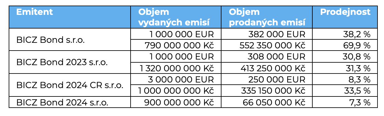 Následující tabulka uvádí prodejnost jednotlivých (dosud nesplacených) emisí v čase. V kostce: nejstarší program má vyprodáno 70 %, zatímco programy z let 2023 a 2024 už jen 31-33 % a nejnovější program od BICZ Bond 2024 s.r.o. jen 7 %.