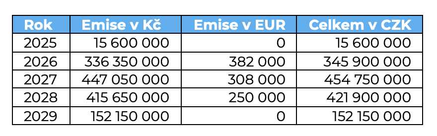 Od roku 2022 si každoročně schvaluje dluhopisové programy: v roce 2022 to byl jeden (na 1 mld. Kč), v roce 2023 byly 2 (750 mil. a 1,5 mld.) a loni také dva (1 mld. a 2,5 mld.). Nikdy se nejedná o aktualizaci starého programu, ale o založení nového. Skupina si tak za tři roky schválila unikátní dluhopisové programy na 6,75 mld. Kč (!!)