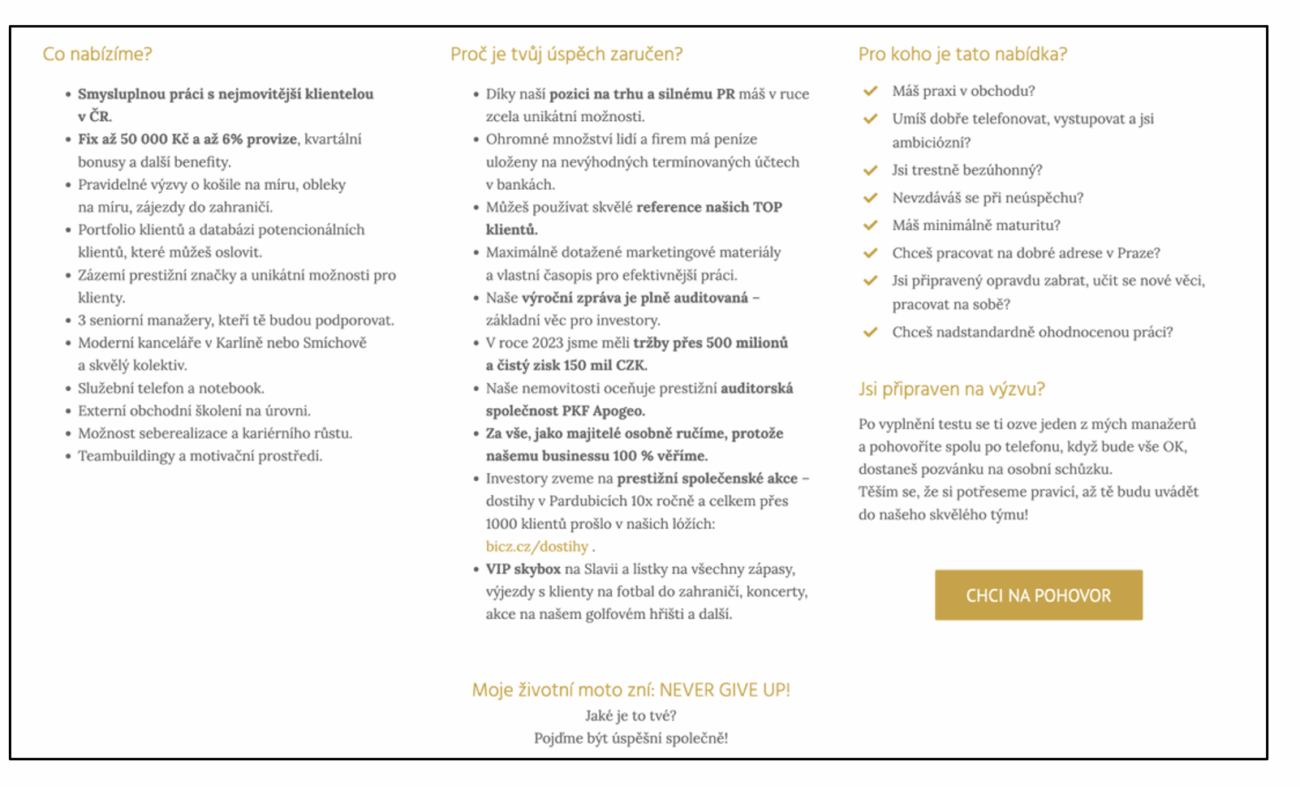 Dluhopisy (i jiné finanční produkty) navíc prodává velmi agresivně. Nebuduje primárně síť nezávislých poradců, ale silně provizně motivovaný prodejní tým, kterému dává do ruky marketingové argumenty typu „audit, zisk 150 milionů, osobní ručení majitelů“ a láká ho na VIP zážitky se „smysluplnou prací pro nejmovitější klientelu“. V kombinaci s konstrukcí dluhopisů bez zajištění a slabou transparentností to vytváří prostředí, kde je tlak na prodej mnohem silnější než tlak na férové vysvětlení rizik.
