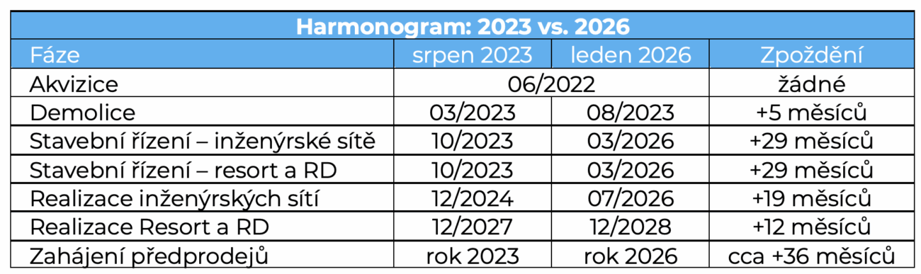 Zatímco v roce 2023 počítala firma se zahájením stavebních řízení už na podzim 2023, nový prospekt uvádí podání stavebního řízení na inženýrské sítě i na samotný resort a domky až v březnu 2026 – tedy zpoždění zhruba o 29 měsíců. Realizace inženýrských sítí se posouvá z prosince 2024 na červenec 2026 (zhruba o 19 měsíců) a vlastní výstavba resortu a domků z prosince 2027 na prosinec 2028 (o jeden rok). Předprodeje, které měly původně běžet už od roku 2023, se nově odsouvají až na rok 2026, tedy přibližně o tři roky.