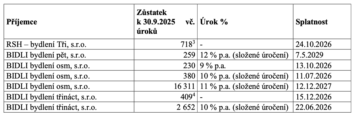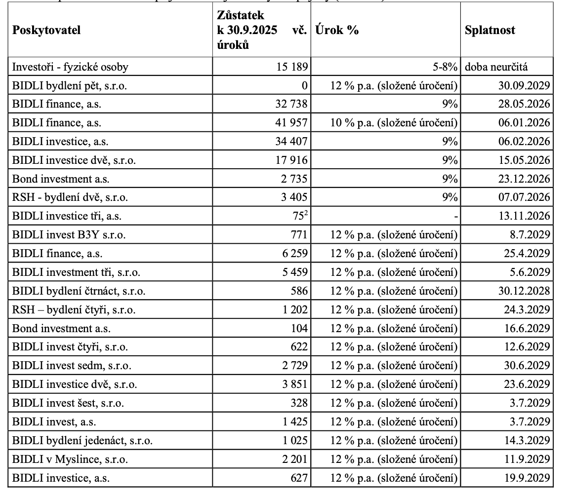 Z čísel je vidět, že Bidli development stojí na výrazném objemu cizích zdrojů. Část dluhu tvoří zápůjčky od fyzických osob s úrokem zhruba v pásmu 5–8 % ročně a bez pevné splatnosti. Vedle toho ale firma čerpá velké množství úvěrů a zápůjček od jiných společností ve skupině. U těchto vnitroskupinových úvěrů se úroky běžně pohybují kolem 9–12 % ročně, někdy navíc se složeným úročením, a splatnosti jsou koncentrovány zhruba do období let 2026 až 2029. Výsledkem je poměrně drahé financování a zároveň časově soustředěná „vlna“ závazků, kterou bude muset firma v několika málo letech zvládnout buď splatit z výnosů projektů, nebo refinancovat.