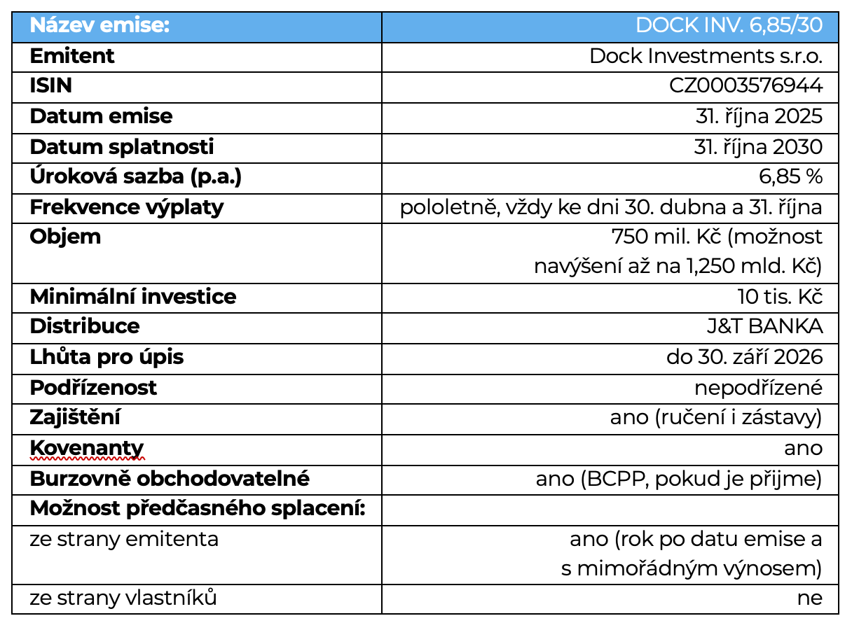 Dluhopisy jsou na pět let za roční výnos 6,85 % vyplácený pololetně. Emise by měla být obchodována na pražské burze, je zde ale možnost předčasného splacení, a to již po roce, takže hrozí riziko refinancování. Co zaujme je to, že právě J&T Banka, jejíž úvěr má být z výtěžku splacen, zde funguje jako distributor. Tato situace není úplně neobvyklá, ale banka zde má samozřejmě extra zájem, aby emise proběhla úspěšně, protože získá zpět své prostředky a zároveň odměnu za prodej emise.