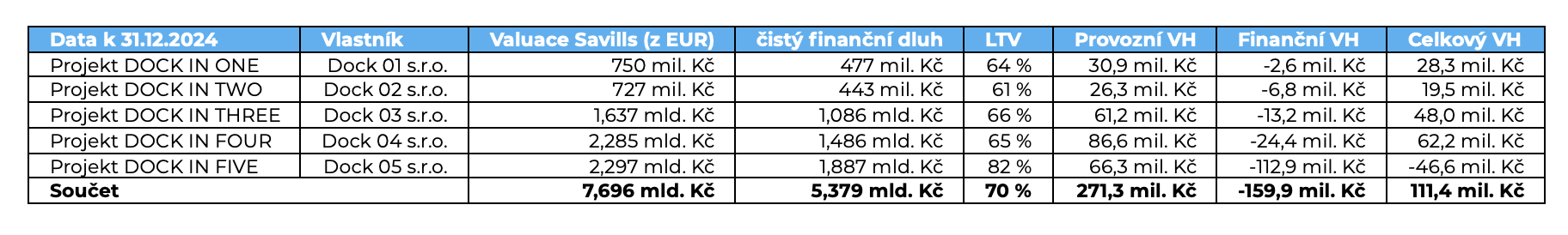 Tři interní úvěry v celkové výši cca 13,9 mil. EUR (úvěry DOCK 01, DOCK 02, DOCK 03 → ručiteli) jsou podřízené seniorním pohledávkám. Seniorní jsou i dluhopisy a platby z finanční záruky.
