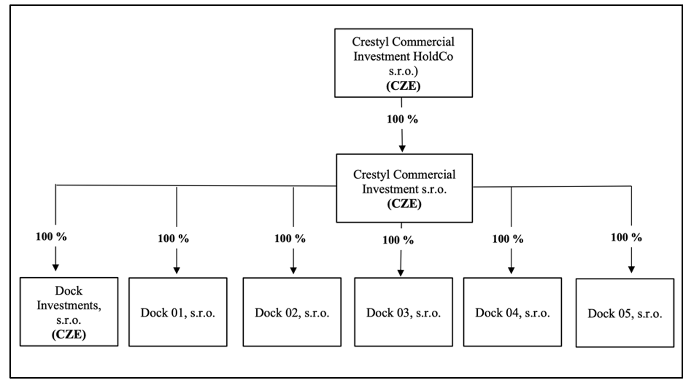 Crestyl Commercial Investment vlastní projekt přes 5 projektových firem, z nichž každá vlastní jednu budovu: