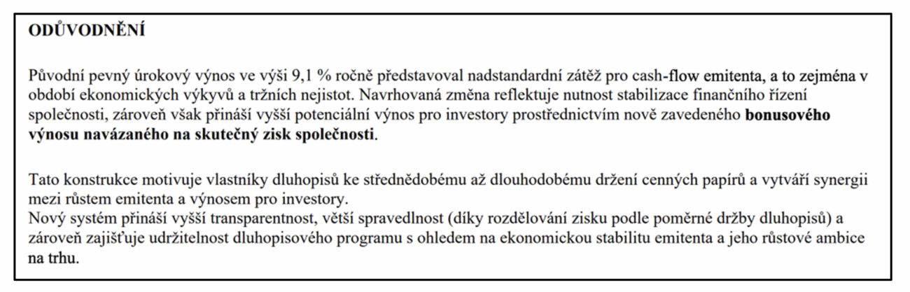 Samotné odůvodnění je už opravdu výsměch všem věřitelům. „Výnos byl moc vysoký, tak vám ho snížíme a de facto z vás místo dluhopisářů uděláme 25% akcionáře u firmy, která nemá zisky a o které nic nevíte.“