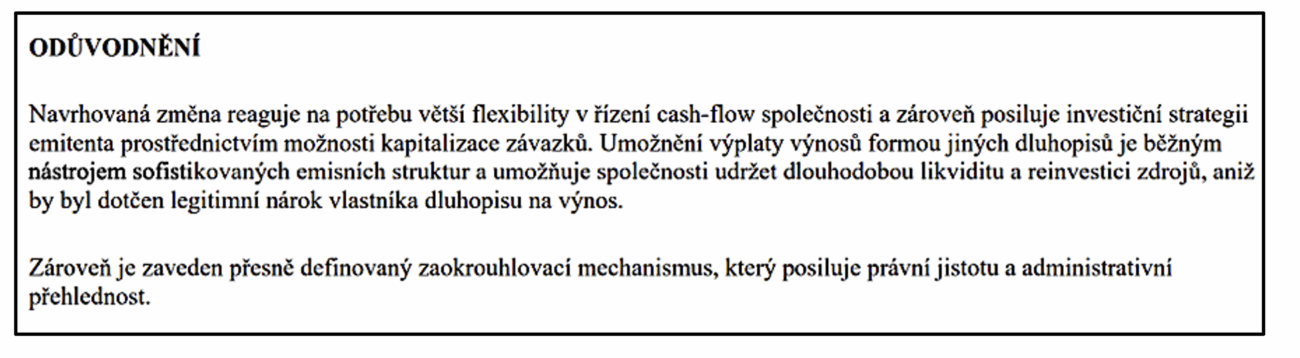 Toto je další perla v rámci změn, které se na této schůzi odhlasovali. A sice, že emitent ani ten 2,1% výnos platit nemusí, protože se zkrátka může rozhodnout investorům místo toho vyplatit novými dluhopisy.