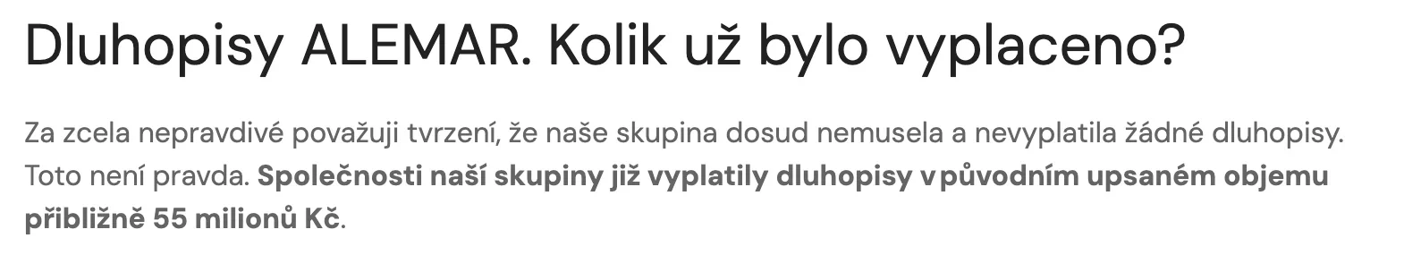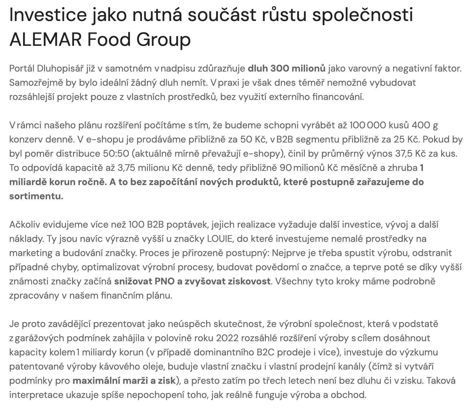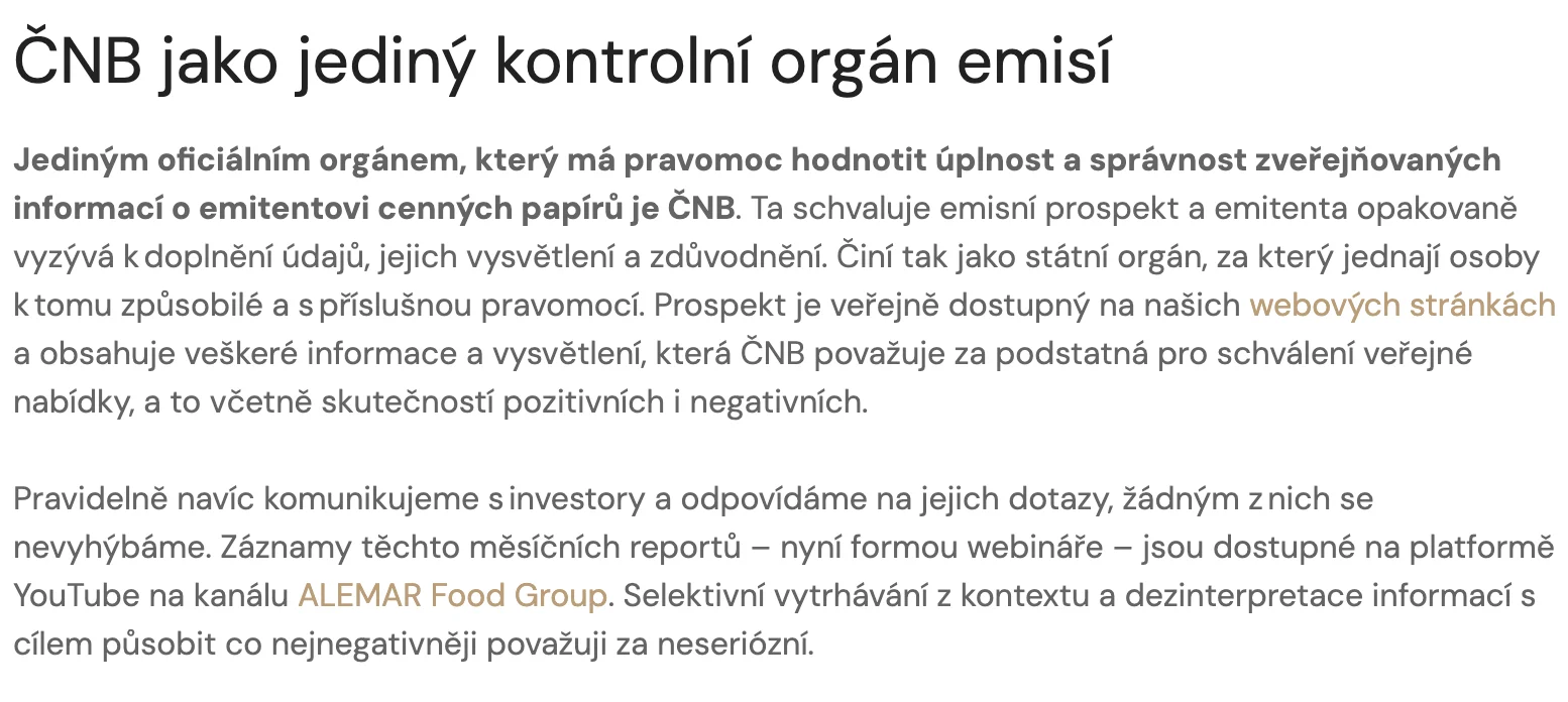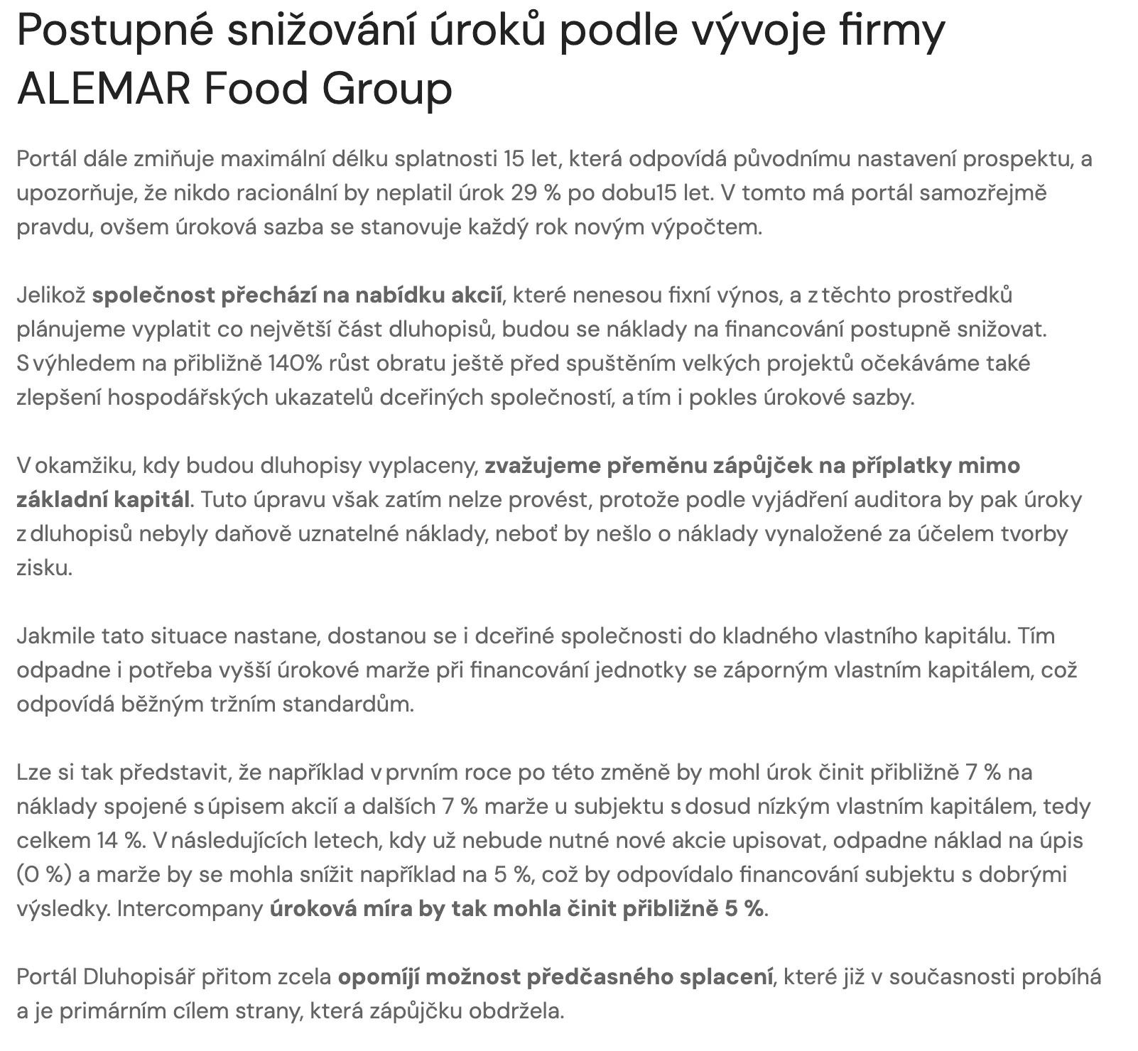 Emitent zde opět reaguje na tvrzení, které jsme v této podobě neučinili. Náš článek analyzoval prospekt dluhopisového programu emitenta ALEMAR Food Group a.s., nikoli jakékoli historické či podlimitní emise libovolných osob napojených na skupinu. V textu bylo výslovně uvedeno, že se bavíme o programu zřízeném v roce 2022, o 15 emisích v celkovém objemu 673 milionů Kč a o prodaných dluhopisech za 320 milionů Kč. Právě v tomto kontextu jsme psali, že firma zatím nemusela splácet jistiny a že první splatnost ji čeká v lednu 2026. Tvrzení emitenta, že „společnosti skupiny“ již vyplatily jiné dluhopisy za přibližně 55 milionů Kč, proto nevyvrací naši poznámku k analyzovanému programu ALEMAR Food Group a.s. Pouze směšuje širší historické financování skupiny s konkrétními prospektovanými emisemi, které byly předmětem článku.