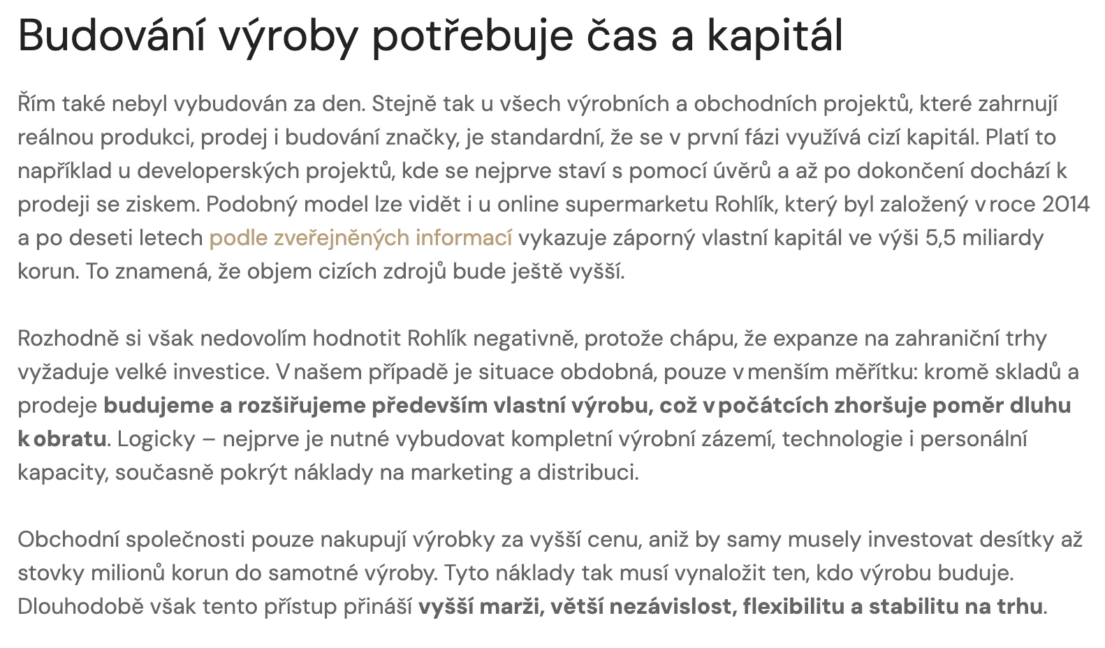 Ani zde není sporem, že vybudování výroby vyžaduje čas a kapitál. Sporem je, jakým kapitálem je tento růst financován a kdo nese riziko. Přirovnání k Rohlíku nebo developerům proto míří mimo podstatu věci: u ALEMARu nejde o běžnou poznámku, že mladá firma investuje a zatím není bez dluhu, ale o její rizikovou kapitálovou strukturu.