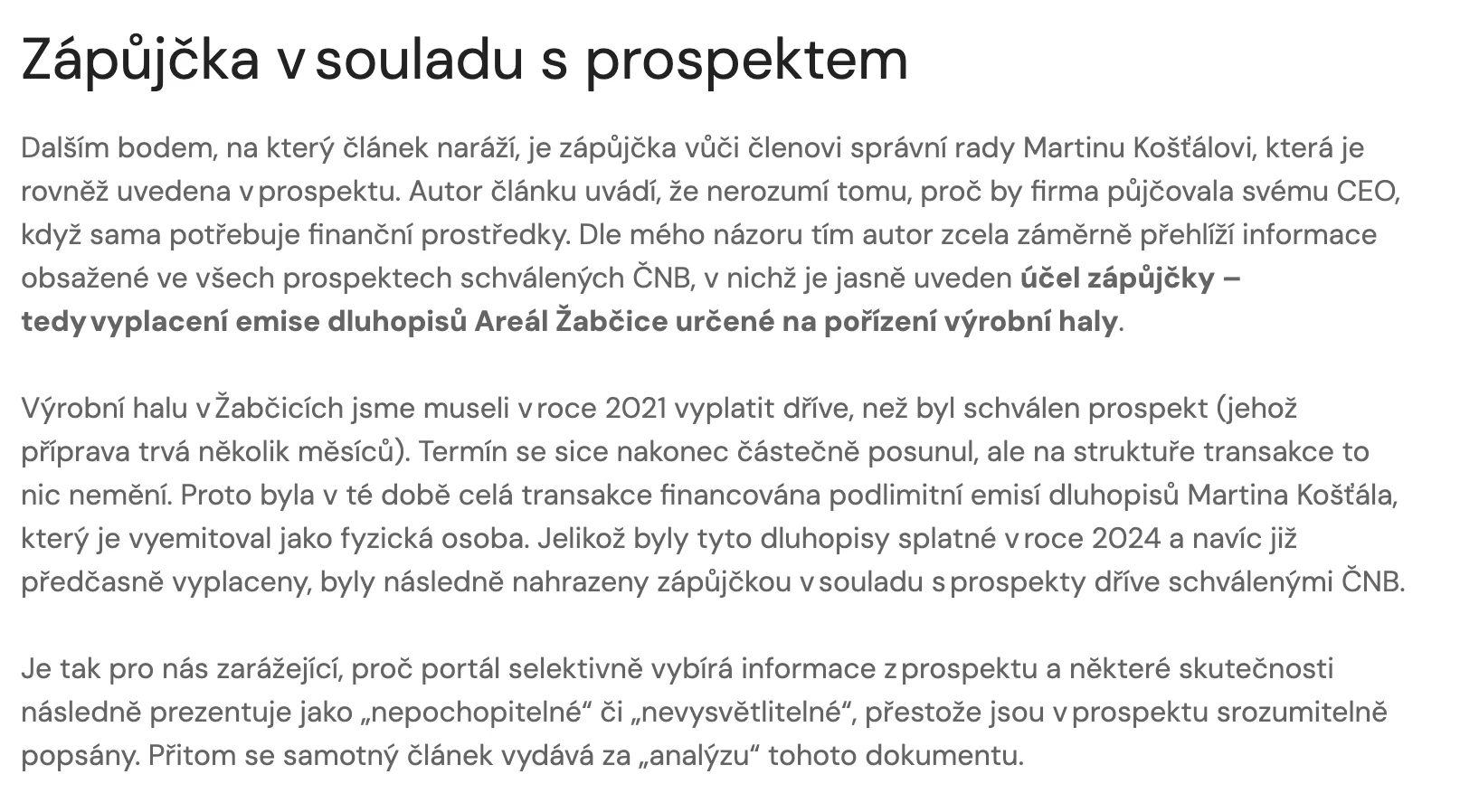Emitent tvrdí, že jsme „záměrně přehlédli“ účel zápůjčky, který má být podle něj jasně uveden ve všech prospektech. V analyzovaném základním prospektu z roku 2025 však u konkrétní pohledávky za Martinem Košťálem tento účel uveden není. Prospekt obecně připouští jako jeden z možných způsobů využití výtěžku „poskytnutí zápůjčky panu Martinovi Ioan Košťálovi“, ale u samotné významné smlouvy uvádí pouze parametry zápůjčky: částku, splatnost do roku 2038 a úrok 29 % p.a. Nevysvětluje zde, že by tato konkrétní pohledávka sloužila k vyplacení emise Areál Žabčice určené na pořízení výrobní haly.