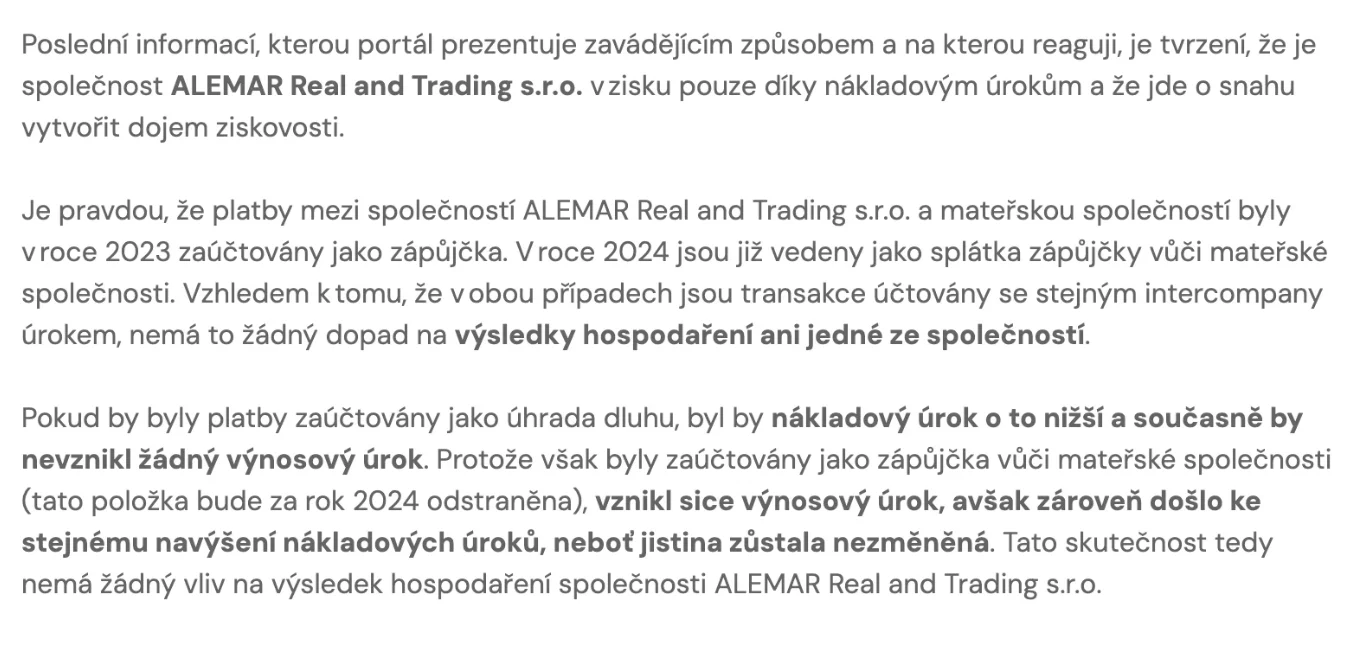 Emitent zde opět posouvá naši kritiku jinam. V původním článku jsme netvrdili, že ALEMAR Real and Trading s.r.o. byla v zisku „díky nákladovým úrokům“ — to by samo o sobě nedávalo smysl, protože nákladový úrok výsledek hospodaření snižuje. Upozornili jsme naopak na to, že společnost byla v roce 2023 provozně stále ve ztrátě, ale v konečném výsledku se dostala do zisku díky výnosovým úrokům ve výši zhruba 3,5 milionu Kč. To je u obchodní společnosti důležité, protože výnosové úroky z vnitroskupinové operace nejsou totéž co zisk z běžné obchodní činnosti.