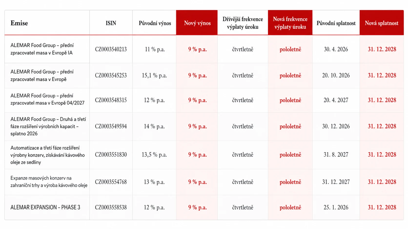 U těchto emisí byla schválena stejná změna: výnos 9 % p.a., pololetní výplata úroků vždy k 1. únoru a 1. srpnu a nová konečná splatnost 31. prosince 2028. Oznámení však neobsahuje přijaté změnové usnesení u zbývajících 6 emisí:
