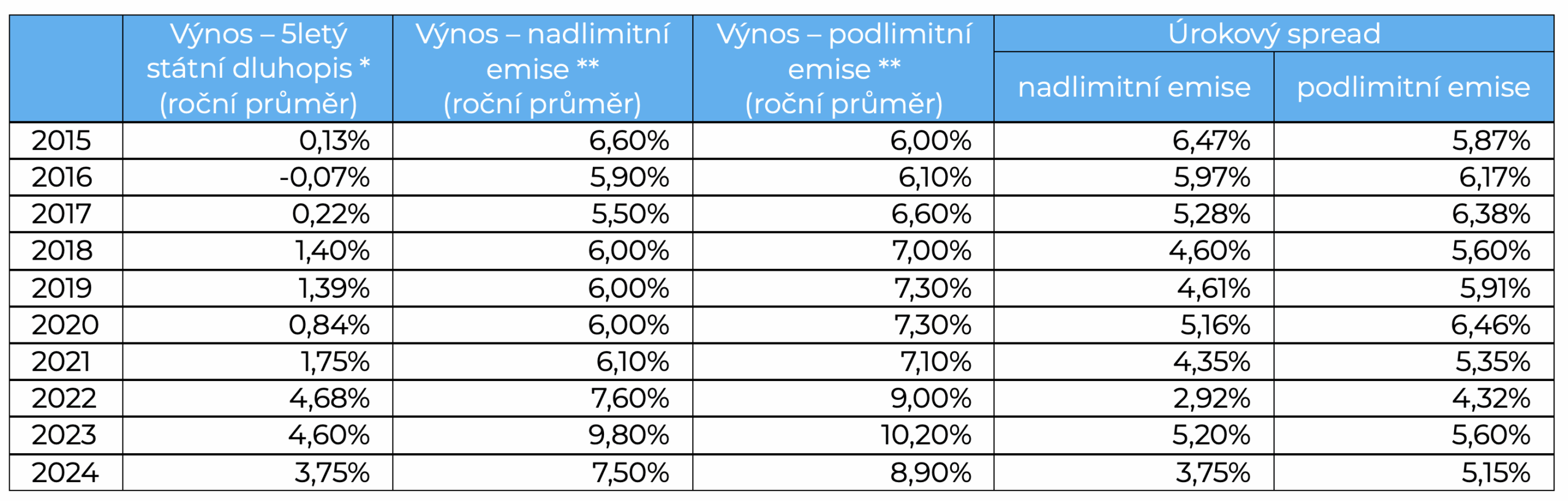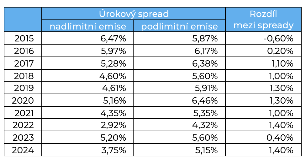 Trh firemních dluhopisů tak přestal reagovat na měnové utažení. Naopak, šel proti němu. Důvod, proč se to stalo, je prostý: ve stejné době totiž na trhu došlo k úplnému kolapsu úrokového spreadu (což demonstrujeme na následující tabulce), a retailoví investoři si to zkrátka „nechali líbit“. V roce 2015 činil průměrný úrokový spread mezi českými korporátními a státními dluhopisy 6,47 %. V roce 2024 už jen 3,75 %. Během necelé dekády tak došlo k více než 40% poklesu úrokového spreadu, a to navíc v období, kdy dramaticky rostla inflace, úrokové sazby i makroekonomická rizika. Jinými slovy: trh přestal požadovat zaplaceno za riziko. Za normálních okolností se úrokový spread při růstu základních sazeb buď drží, nebo se zvětšuje, aby odrážel napjatější podmínky. V českém případě se však snížil: investoři byli paradoxně čím dál více ochotni přijmout nižší výnos než dříve, a to v době, kdy riziko defaultů rostlo. Vůbec nejhorší byl v tomto ohledu krizový rok 2022, kdy se u nadlimitních emisí propadl spread na více než polovinu oproti roku 2015.