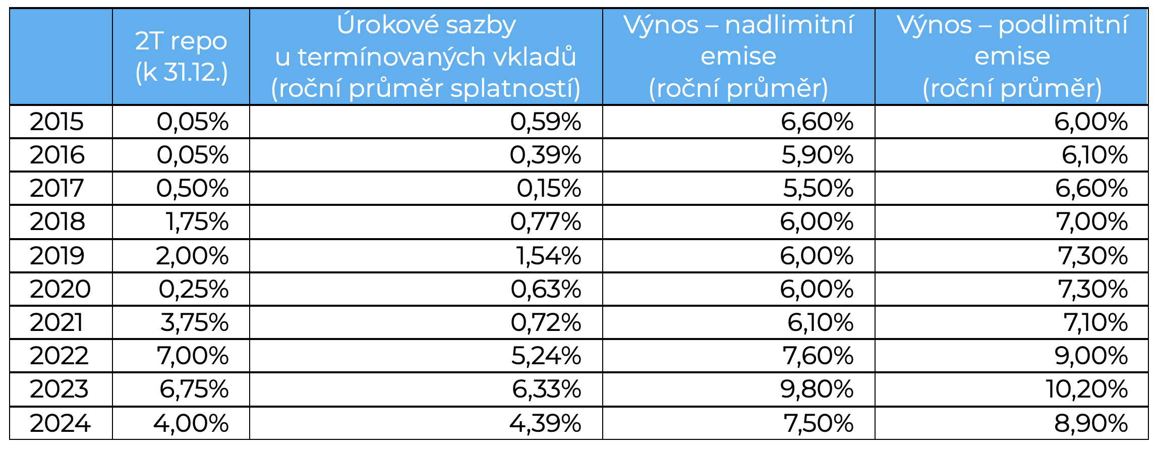 Vývoj ukazuje, že repo sazba a klientské sazby na vkladových produktech se chovaly tak, jak měly. Sazba ČNB vzrostla z 0,05% na 7 % a poté zpátky na 4 %. Sazby klientů následovaly stejnou trajektorii (nízké v letech 2015-2022), poté prudký nárůst v roce 2022 a ochlazení v roce 2024. Teď do toho zahrňte chování výnosů na firemních dluhopisech. Zatímco repo sazba vzrostla mezi roky 2015-2022 o +6,95 procentního bodu a výnosy na vkladech o +5,80 p.b., výnosy na firemních dluhopisech jen +3 p.b. u nadlimitních emisí a (což je ještě horší) jen o +1 p.b. u podlimitních (rizikovějších) emisí.