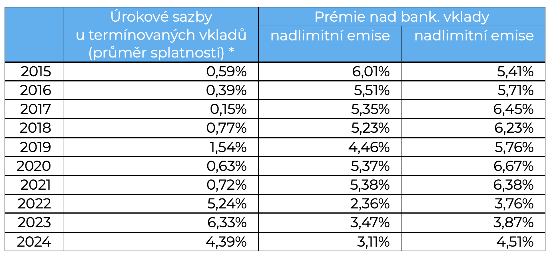 Rok 2022 je vůbec rokem, kdy na trhu přestala existovat jakákoliv racionalita. Repo sazba byla 7 %, bankovní vklady vynášely průměrně 5,24 % a nadlimitní emise se nabízely průměrně za 7,60 %. Dluhopisoví emitenti tedy platili (převážně retailovým) investorům jen o 1,75 p.b. více, než kolik by tito investoři dostávali v bance za pojištěný (prakticky skoro bezrizikový) vklad. A to v době, kdy inflace přesahovala 15 %. Investoři tím pádem podstupovali výrazné kreditní riziko za reálně záporný výnos (ex-post).