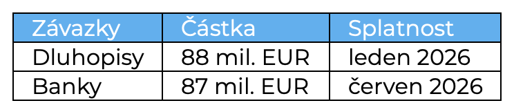 Skupina se financuje hlavně bankami (113 mil. EUR) a dluhopisy (85,4 mil. EUR). Ostatní úvěry (6,5 mil. EUR) jsou spíše zanedbatelné. Kromě samotné výše zadlužení představuje problém i to, že dluhopisová emise z roku 2021 a naprostá většina objemu bankovních dluhů jsou splatné v první polovině 2026: