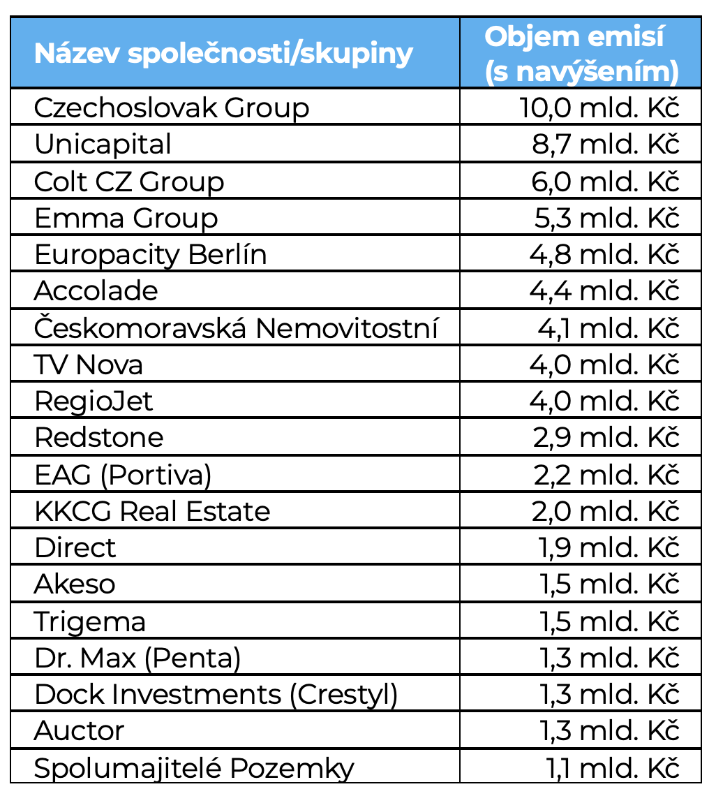 - Největší emise roku: CSG (10 mld. Kč)