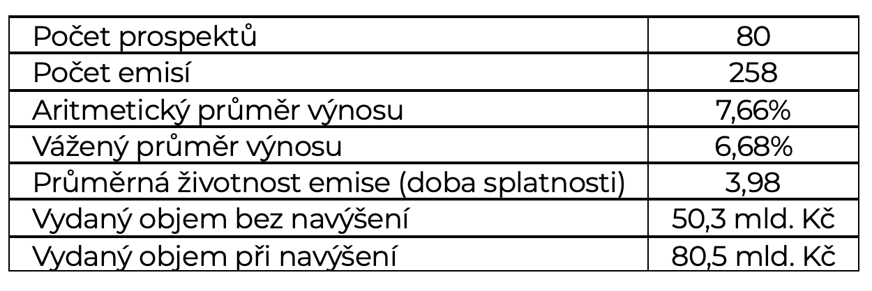Pánové Svěrák a Uhlíř měli pravdu jen částečně, statistika může být velmi zajímavá. Jako třeba následující tabulka, podle které se v minulém roce vydalo 258 emisí za 80 miliard korun (s navýšením) s průměrnou dobou splatnosti 3,98 let a průměrnou úrokovou sazbou 7,66 %. Zaujme i přepočet průměrné sazby na vážený průměr podle objemu, který dokazuje, že průměrnou sazbu zvyšují menší, početnější a zároveň dražší emise od rizikovějších emitentů. Při přepočtu na vážený průměr podle objemu emisí se průměrný výnos na trhu snižuje na 6,68 %.