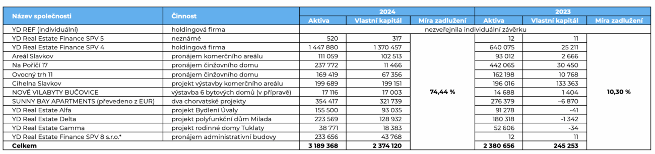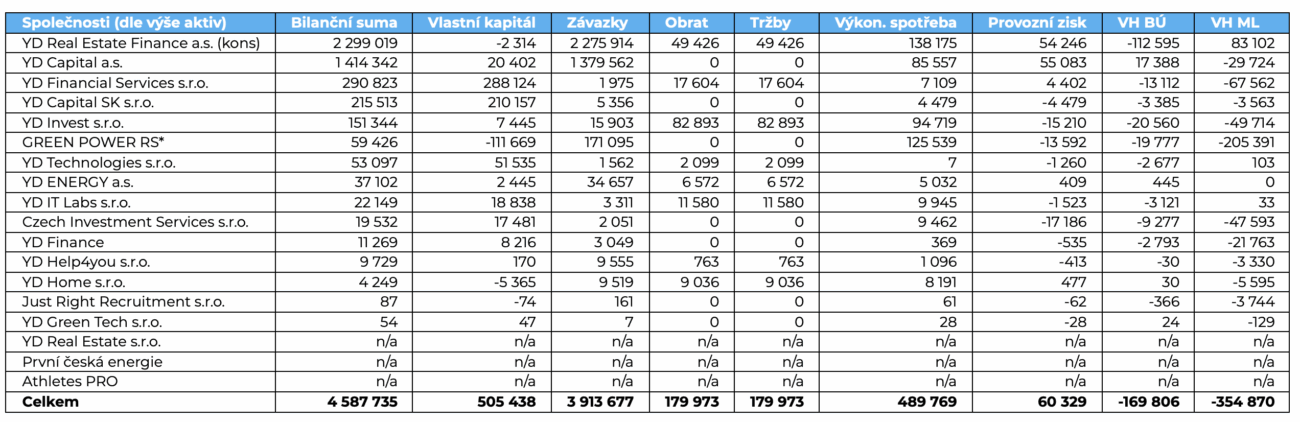 Následující tabulka uvádí nekonsolidovaný přehled ekonomiky všech firem uvnitř YD Capital k roku 2024. Firmy YD Real Estate, První česká energie a Athletes PRO závěrky za rok 2024 nezveřejnily.