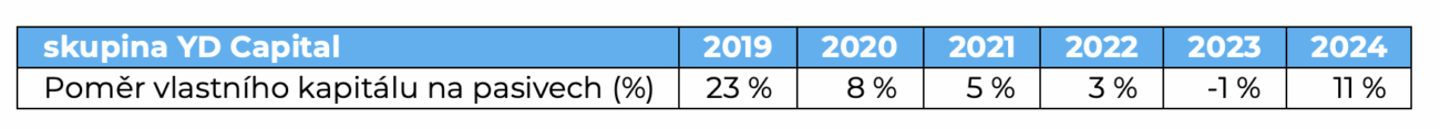 Finanční situace skupiny YD Capital k 31.12.2024 nebyla vůbec příznivá. Celková nekonsolidovaná aktiva skupiny činila 4,59 mld. korun s vlastním kapitál pouze půl miliardy korun. To odpovídá pákovému efektu cca 7,7x. Co je ale horší, že oněch 505 milionů ve vlastním kapitálu je uměle „nafouknutých“ kvůli konverzi vnitroskupinových dluhů na ekvitu.