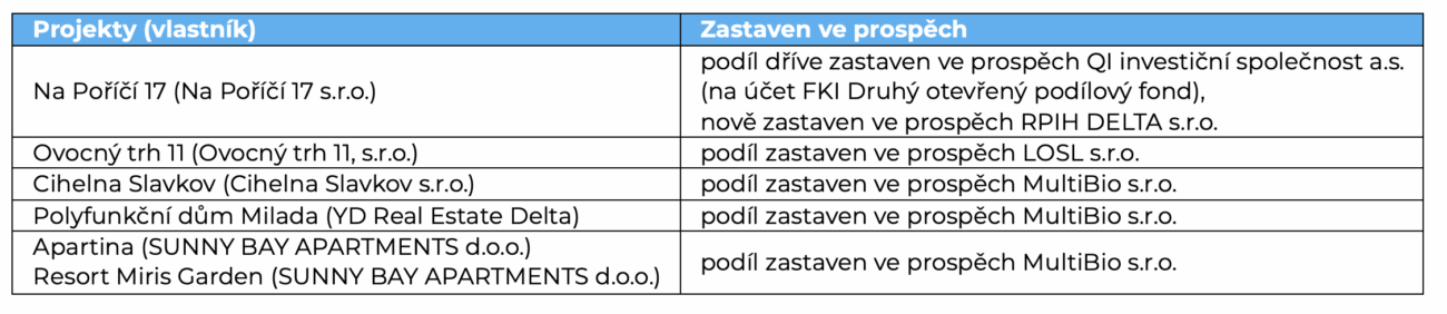 Obě uvedené společnosti přitom patří stejnému majiteli, což znamená, že část developerských aktiv skupiny YD Capital je zastavena ve prospěch jednoho fyzického podnikatele, který není bankou ani investiční institucí.