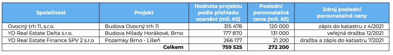 Z ní vyplývá, že hodnota uvedených tří projektů prezentovaná investorům je 759 milionů korun, navzdory tomu, že pořizovací hodnota těchto nemovitostí byla v roce 2021 pouze 272 milionů korun a v mezičase nedošlo podle dostupných informací k žádné developerské činnosti, či změnám územního plánu, které by nárůst hodnoty ospravedlnily. Původní účetní cena u projektu na adrese Milady Horákové v Brně byla navíc již sama o sobě údajně nadhodnocená v době pořízení, a to poměrně výrazně. Budova byla totiž skupinou YD Capital podle článku denik.cz z prosince 2021 vydražena od města Brna v otevřené dražbě za 131 milionů korun, což mělo představovat 454 % její odhadní ceny.