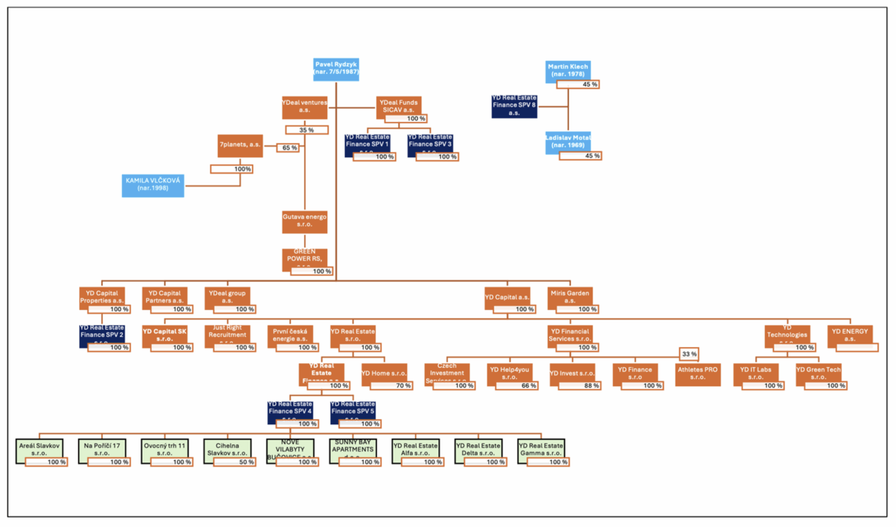 YD Capital je investiční skupina s počátky v roce 2019. Výlučné vlastnictví a kontrolu nad ní drží osmatřicetiletý podnikatel Pavel Rydzyk. Ten dokázal za šest let existence vybudovat holding s bilanční sumou v jednotkách miliard korun. Jde o skupinu, kde celkové dluhy budou dosahovat částky přes 3 miliardy korun. Nejedná se tedy o malou společnost.