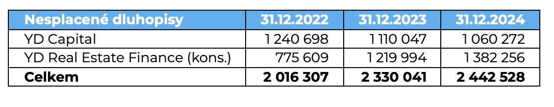Zároveň od té doby vydala ještě mnoho dalších neveřejných emisí, proto také dluží na dluhopisech přes 1 miliardu korun. Významnou část vydaných dluhopisů proto YD Capital musela nabízet bez zveřejnění prospektu prostřednictvím neveřejné nabídky.
