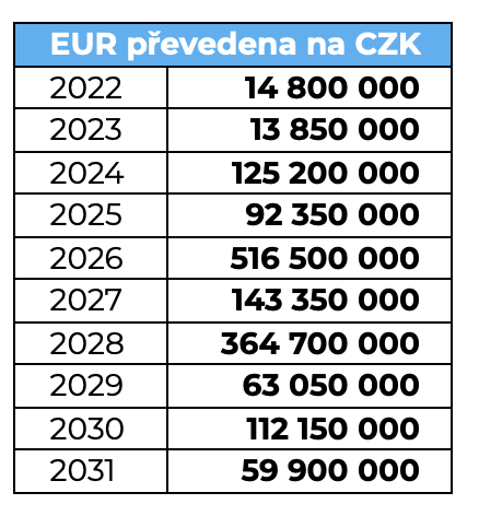 - -1,3 milionu EUR (~ -32 mil. Kč) v roce 2022,