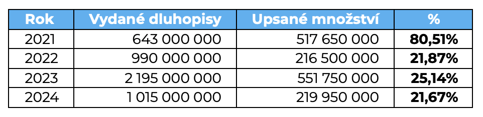 V této tabulce uvádíme úspěšnost emisí YD REF vydaných na schválené prospekty v jednotlivých letech: