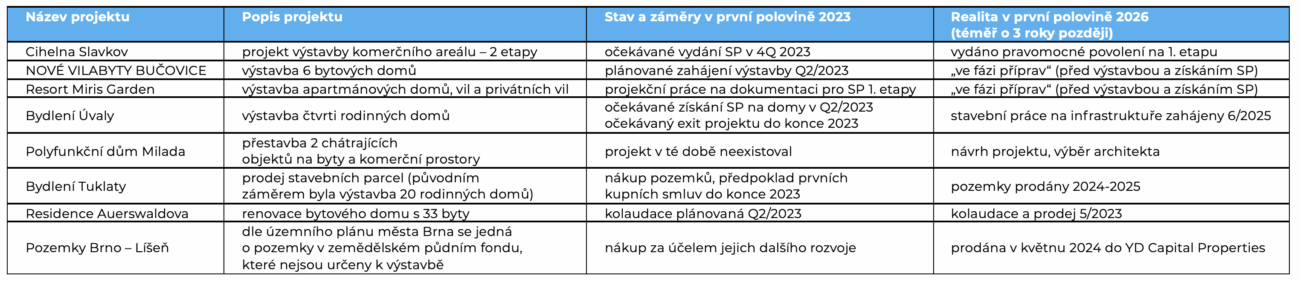 Aktivní developerské projekty z prospektu 2023: stav na začátku 2026