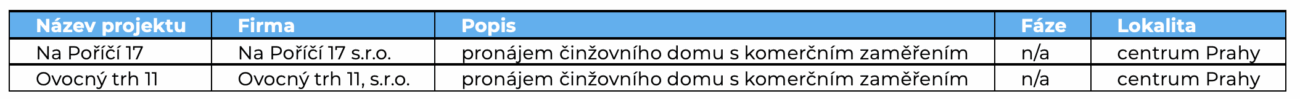 Pokud jde o tyto dvě pronajímané nemovitosti v centru Prahy, jejich firmy nezveřejňují výsledovku. Firmě Na Poříčí 17 ale každoročně klesá vlastní kapitál (z 51 na 11 milionů korun mezi roky 2021-2024), což lze vysvětlil ztrátami. Firma Ovocný trh 11 měla mezi lety 2022-2023 také pokles vlastního kapitálu, rok 2024 byl ale vlastní kapitál pravděpodobně ovlivněn konverzí interního dluhu (viz níže).